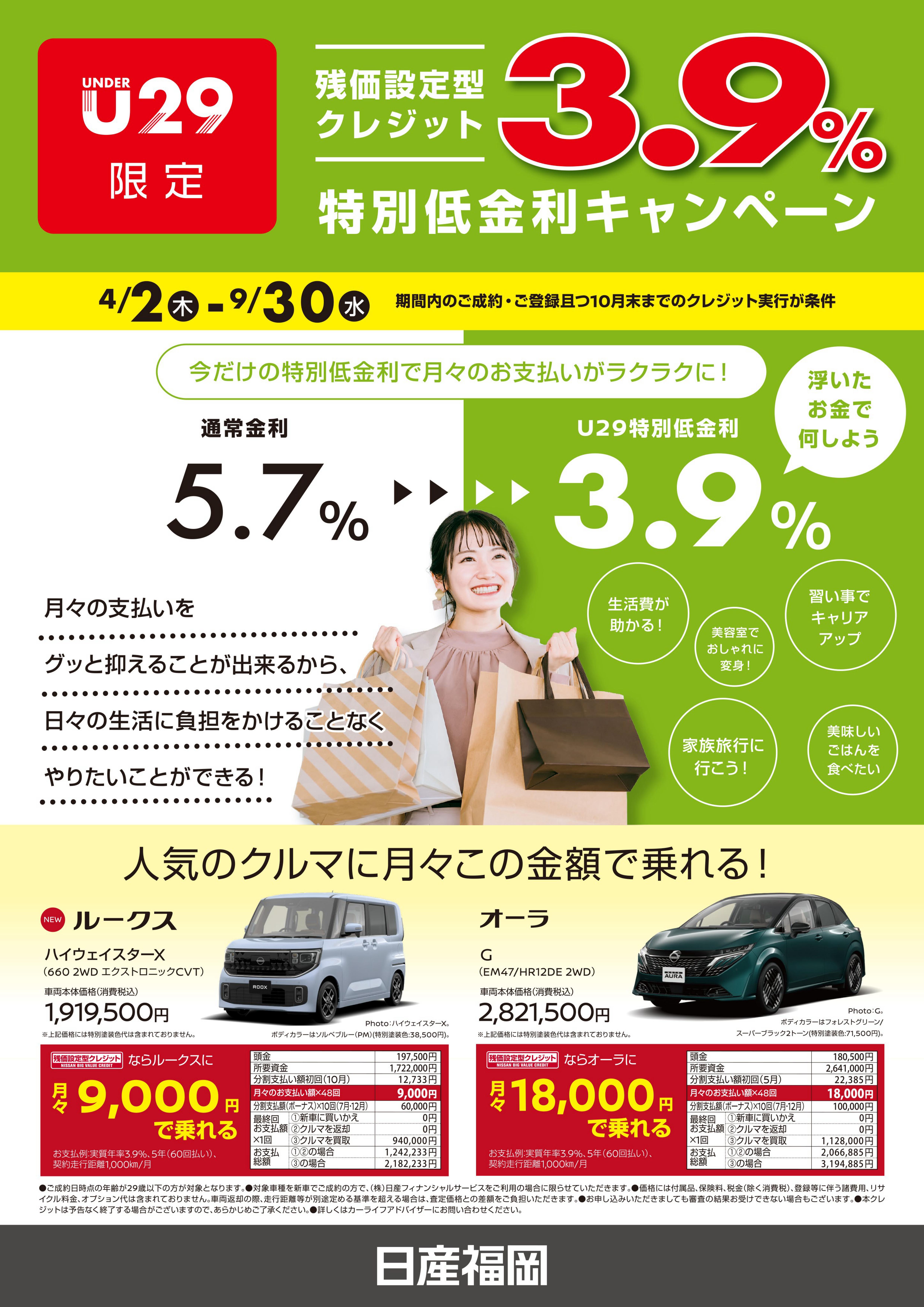 日産福岡はU29を全力サポート!残価設定型クレジットで新車を購入する場合、特別低金利3.9%を適用!